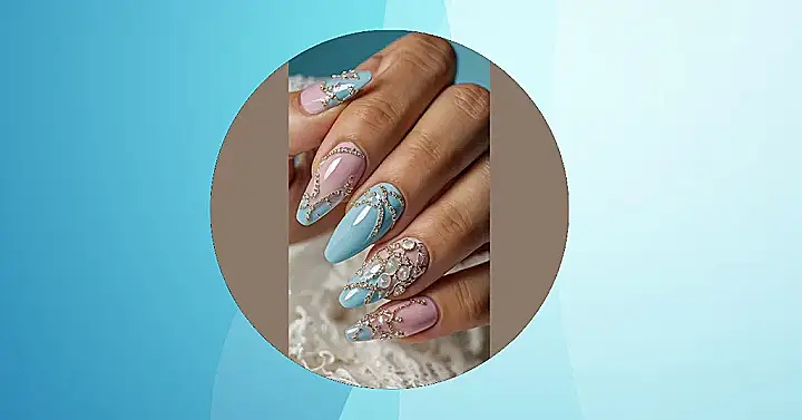 Check out these nails! They look like something a mermaid princess would wear to a fancy beach party in the future, specifically Summer 2025. With that shiny blue like the ocean and soft pink like a sunset, plus all that sparkly gold stuff and gems, they’re definitely not shy. Imagine trying to give a high-five with these bad boys – it would be a literal sparkle explosion! They’re giving off serious “look at me, I’m fancy!” vibes.