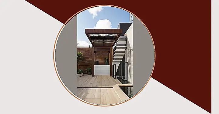The whole setup is super modern, with the cool glass roof and wooden deck. It’s the perfect blend of nature and technology. The potted plants and airy curtains add a touch of zen, while the canopy makes it feel like you’re in a secret hideaway. This canopy design is definitely the place to be when the weather is either trying to burn you alive or soak you to the bone.