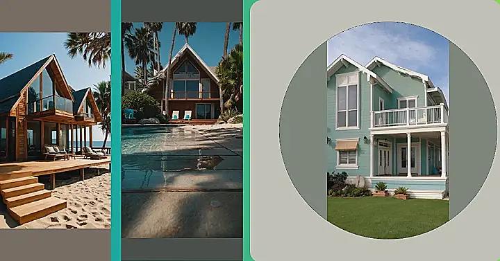 The picture shows a super chill beach house with a pool that looks like it’s calling your name. Imagine waking up, grabbing your swimsuit, and jumping right in! The comfy lounge chairs make it perfect for just relaxing and soaking up the sun, while the little house in the back is the perfect spot for escaping the heat and taking a nap. It’s the kind of place where you could hang out with friends, read a book, or just chill out and enjoy the ocean breeze.