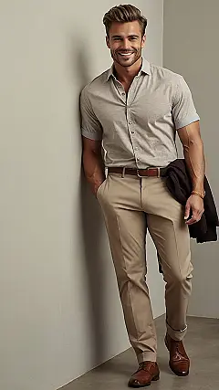Hey there, future fashion icon! This guy totally nailed the “mens casual shirt outfits” look, right? It’s all about feeling comfortable but still looking sharp enough to impress your friends (and maybe even that cute girl in your math class). That light-colored shirt is perfect for summer—it’s breezy, stylish, and wouldn’t you know it, goes great with khaki pants. Who needs a superhero cape when you’ve got a killer outfit?