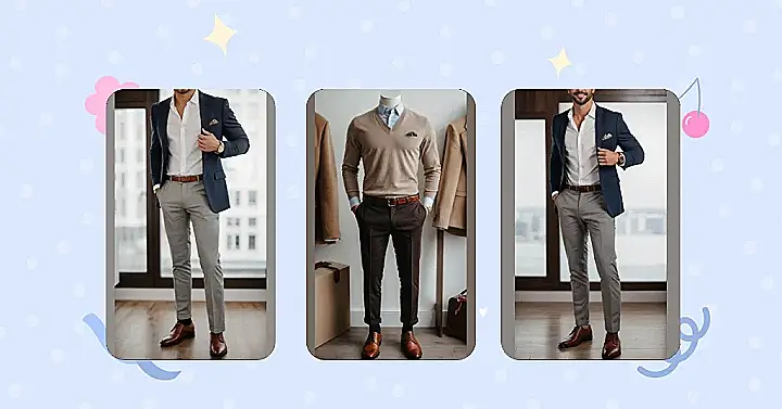 Getting this look right is also about the little things that make a big difference without being complicated. Take a peek at those shiny shoes and the belt that totally matches – it’s a simple trick that makes everything look polished. And that little piece of fabric popping out of the sweater pocket? That’s a pocket square, like a tiny flag saying, “Yep, I thought about this!” It all comes together to create an outfit that’s comfy enough to chat in, sharp enough for photos, and perfect for chilling at a not-too-casual party.