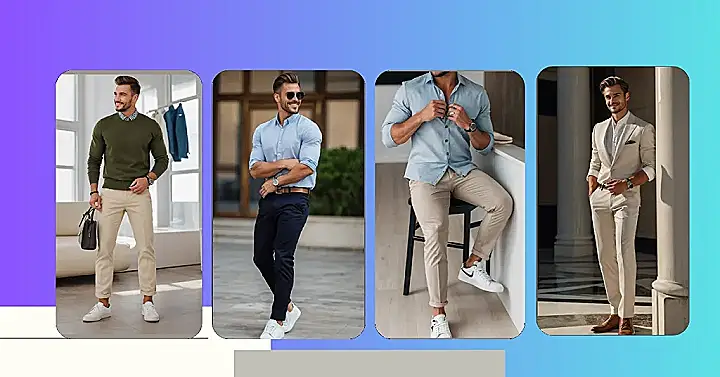 This guy’s got it going on! He’s rocking the smart casual look, which is like the superhero of outfits. It’s perfect for anything from a presentation at school to a casual date night. See that green sweater? It’s comfy enough for hanging out, but the crisp white shirt peeking out underneath says, “I’m ready to impress!” Plus, those tan pants and white sneakers are a classic combo that’s always in style.
