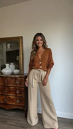 **Paragraph 1:** Okay, picture this: It’s fall, the leaves are turning all sorts of gorgeous colors, and you’re heading to a super fun brunch. This outfit is the perfect blend of cozy and chic – think warm pumpkin spice latte vibes but way more stylish. That burnt orange sweater is seriously dreamy, and paired with those wide-leg beige pants, it’s like a sophisticated hug. It’s the kind of outfit where you’ll feel comfortable enough to eat all the pancakes you want, but still look amazing in all those Instagram photos!