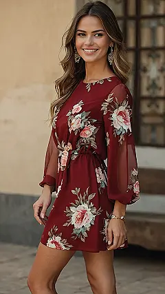 This stunning floral dress is perfect for a casual lunch date, or any occasion where you want to look and feel absolutely fabulous! Imagine strolling through a park, grabbing a bite to eat with friends, or maybe even a romantic lunch with your crush – all while looking as gorgeous as this model. The rich maroon color is totally sophisticated, but the pretty flowers add a fun, flirty touch. It’s the kind of dress that makes you feel confident and ready to take on the world, one delicious bite at a time!