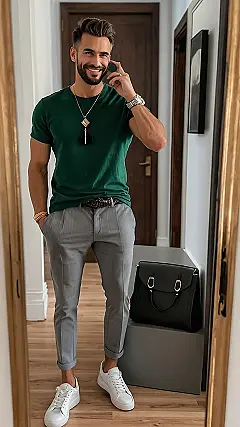 Want to look put-together without looking like you’re trying too hard? Check out this dude! He’s rocking the “I just threw this on but I’m still super stylish” vibe. That green t-shirt is awesome, and those pants? Classic cool. He’s even got the fresh white sneakers, perfect for chilling with friends or maybe even hitting up a fancy-ish dinner.
