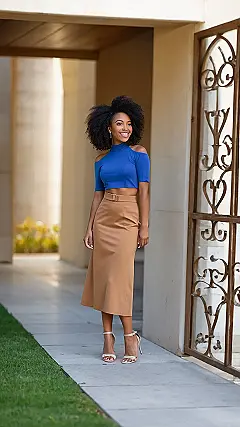 This skirt and top combo is totally giving off sophisticated-but-still-fun vibes! It’s like, perfect for when you want to look put-together for a fancy dinner but also still be cool enough to grab ice cream with your friends afterwards. The high-waisted skirt is super flattering, and the crop top adds just the right amount of chill.