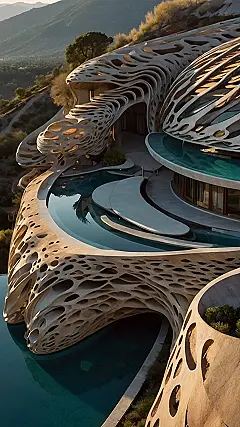 This house looks like it was built by a giant who decided to use a giant sponge as their building material! The whole thing is curvy and loopy, with all these holes and tunnels. It’s kind of like a giant honeycomb, but instead of honey, there’s a swimming pool! It’s definitely not your typical house, and it’s so cool how it kind of flows into the landscape around it, like a giant, organic sculpture.