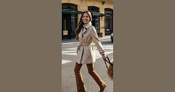 This woman is totally rocking the camel coat look! It’s like she stepped out of a fashion magazine, effortlessly cool and stylish. That creamy camel coat is perfect for a crisp autumn day, and it’s belted just right to show off her amazing figure. The brown pants are the perfect complement – they’re like a warm hug for your legs! Honestly, this whole outfit is giving off major “I’m heading to a coffee shop to write my award-winning novel” vibes.