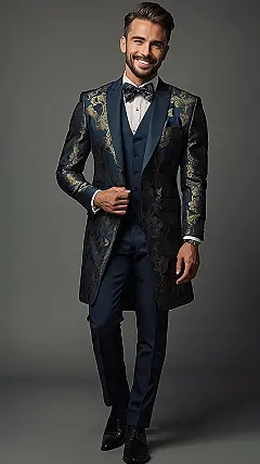 Picture this: You walk into the party, and everyone’s jaw drops. Why? Because you’re rocking a suit that screams, “I’m here to have a good time, and I look amazing doing it!” Forget blending in; this outfit, especially with its cool, patterned jacket, is all about making a statement. It says you’re confident, stylish, and definitely not afraid to stand out from the crowd.
