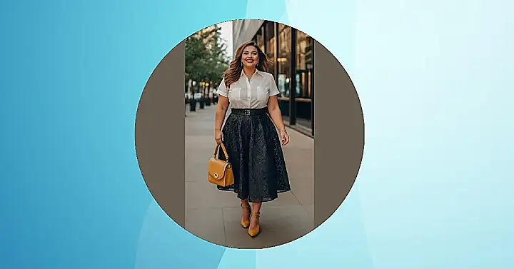 This lady is rocking the plus size fashion scene! She’s got a white button-down shirt that looks super comfy, and a black skirt that’s so fancy it’s almost like she’s going to a royal ball. Plus, those shoes are totally on point – they look like they’re about to walk straight into a magazine photoshoot! It just goes to show you, you can be stylish and comfy at the same time, no matter what size you are.