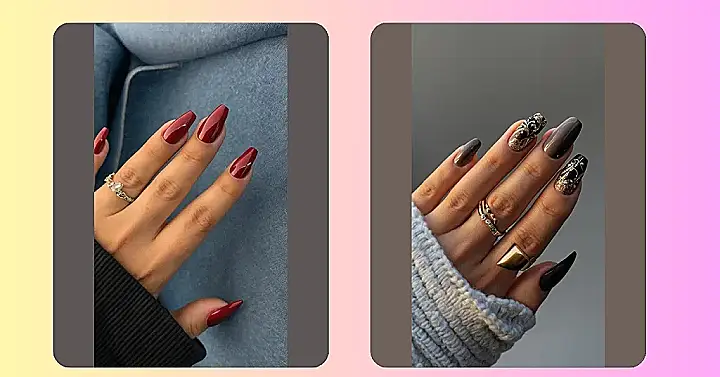 These nails are giving major “sophisticated and chic” vibes. That deep burgundy red is the perfect color for a night out, and the long, elegant shape is just *chef’s kiss*. And look at how shiny those nails are! They’re so smooth, they practically scream “touch me!” You know what? Maybe you should go get your own nails done with this color – it’s so perfect that it’s basically begging you to be trendy!