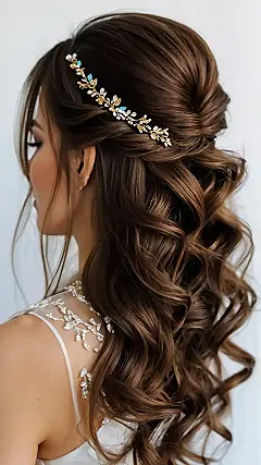 This hairstyle is like a fairytale come true! Imagine getting ready for your big day, feeling like a princess with gorgeous, bouncy curls cascading down your back. Half of your hair is elegantly swept up, perfectly showcasing that dazzling sparkly hairpiece – it’s like a mini constellation of awesome! It’s the perfect blend of sophistication and fun, so you can dance the night away without a single hair out of place (well, maybe a few playful curls!).