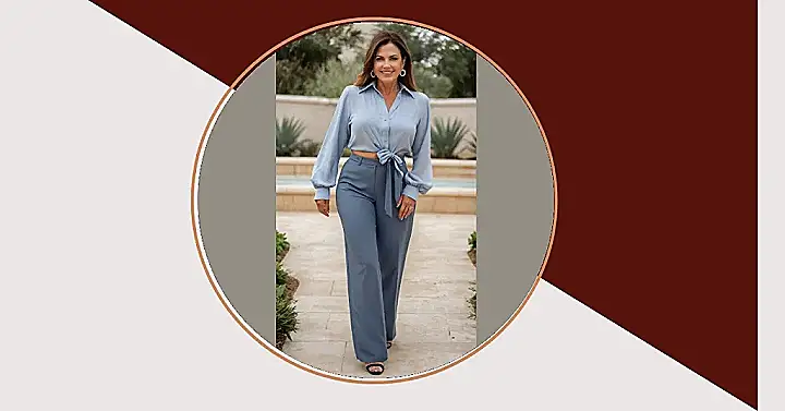 And don’t even get me started on that color coordination! It’s like a calm ocean breeze decided to dress her. Plus, that top is tied in a knot, which is a seriously cool way to upgrade a simple button-down. So, if you’re thinking of borrowing your mom’s pants, maybe add a little of this fierce flair and you will be set.