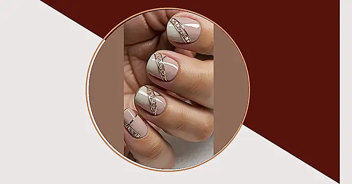 Do you ever look at fancy nails and think, “Wow, but also, how long did that even take?!” Well, these nails are the cool, laid-back cousin of those super complicated ones. They’ve got this sleek diagonal split with creamy nude and blush pink shades, looking effortlessly chic. Then, BAM! A little gold bling-strap crosses over, studded with tiny sparkles. It’s like they’re wearing a minimalist ballgown with just the perfect amount of sparkly jewelry. Definitely simple, definitely classy, and looks way easier than building a nail art skyscraper.