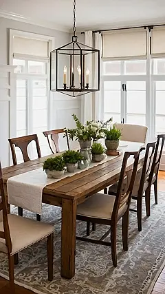 Imagine your dining room as a blank canvas, just waiting for its glow-up! This picture shows how you can totally transform your space into something special. Notice the little details, like the plants and that cool light fixture, that take it to the next level. You can get creative and add your own personal touch too!