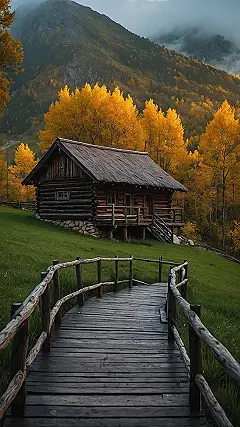 Standing at the start of this cool wooden walkway, you almost expect a friendly creature to pop out or maybe someone offering hot chocolate before you head inside. The little log cabin looks super cozy, totally ready for some serious chill time, probably with a fireplace crackling and zero Wi-Fi. But outside? Whoa! The trees are rocking the most amazing golden outfits, like they just won the fall fashion show in the mountains and are demanding their picture be taken. Trying to capture all that awesome yellow and the slightly shy, misty mountains behind it is like trying to capture a yawn – surprisingly tricky but totally worth the effort if you get the right shot of this stunning landscape.