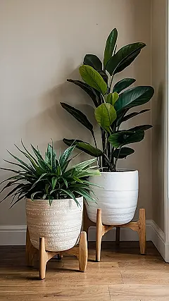 These plants are seriously stylish! Check out how much personality these simple plant stands add to these already awesome indoor plants. It’s like giving your green friends a little wooden throne, which just elevates their whole vibe. Imagine having your leafy buddies looking this good—it’s the ultimate indoor jungle upgrade, even if your jungle only has three members.