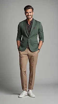 This whole vibe is basically formal fashion for people who still remember how to have fun. He’s wearing a nice dark shirt and those light brown pants, which look way less stuffy than typical suit trousers. It shows that ‘formal’ doesn’t have to mean ‘uncomfortable’ or ‘boring as paint drying’. It’s about picking cool pieces like this green jacket and mixing them with more relaxed stuff. So next time you need to look sharp for something, you don’t have to go full spy-movie formal; just add a cool blazer and maybe keep your favorite sneakers on.