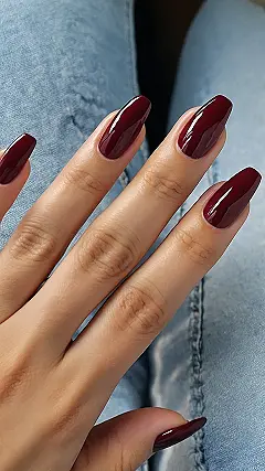 The image shows a hand with some seriously stunning gel nails! The deep burgundy color is so rich and glamorous, it’s like looking at a delicious chocolate bar. You can almost imagine the satisfying “click” of the nail polish drying under the UV lamp, ready for a night out where you can show off these awesome nails!