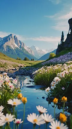 This picture is like a magical anime scene come to life! Imagine a cute anime character skipping along this babbling brook, surrounded by daisies as fluffy as cotton candy. The mountains in the background look like they’re straight out of a fantasy adventure, maybe even a hidden village where magical creatures live. It’s the perfect wallpaper for anyone who dreams of exploring serene, breathtaking landscapes – kinda like a real-life, super peaceful video game level.