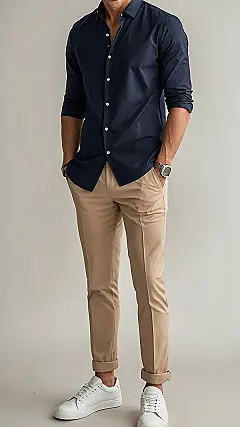 Look at this simple setup: a cool navy shirt, those classic tan pants, and fresh white sneakers. It’s the ultimate proof that smart casual isn’t code for uncomfortable or complicated. The shirt is sharper than a tee but still looks relaxed, the pants are easygoing while looking put-together, and honestly, white sneakers just make everything look instantly cooler and less stuffy. This kind of combo is perfect for places where you need to look presentable but also want to feel like you can actually breathe and maybe even eat without feeling like you’re about to burst a seam.