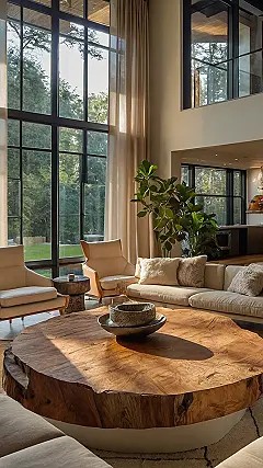 Wow, check out this living room! It’s like stepping into a nature magazine, but way more comfy. That giant wooden coffee table looks like a tree slice – seriously, I bet squirrels would love to have a tea party there. The whole place is super chill, all light and airy with those big windows showing off the trees outside. It’s the perfect mix of “organic” (meaning natural materials like that awesome wood) and “modern” (with the sleek furniture and clean lines). You could totally relax here with a good book and some sunshine.