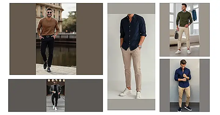 This guy’s got the whole “smart casual” thing down pat, which means he’s ready for anything! He’s rocking a black sweater, a crisp white shirt (peeking out just enough, see?), and some trendy, brown pants. His white sneakers say he’s comfy and ready to hit the streets, but the fancy watch on his wrist shows he’s got style for days! It’s like he’s saying “I’m ready for a meeting, a coffee date, or to run errands in style, bring it on!”