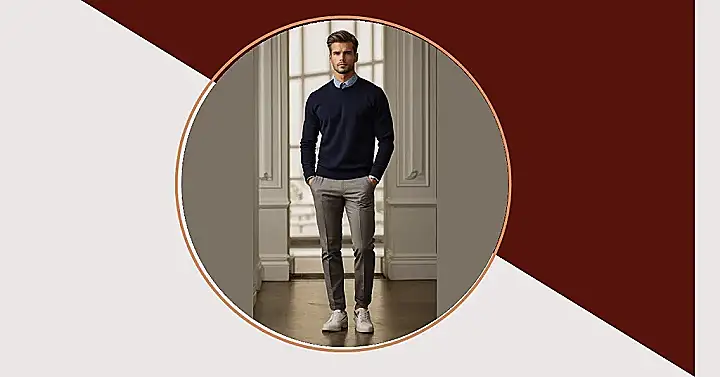 This guy’s got corporate casual down pat! He’s rocking a look that’s totally professional but still says, “I’m cool, I’m comfortable, and I’m ready to take on the world (or at least, that important meeting).” Think stylish beige sweater, sharp navy pants – a winning combo that’s way more exciting than your grandpa’s golf shirt. The white sneakers add a touch of playful rebellion, proving you can be serious *and* stylish at the same time. Who needs a suit when you’ve got this?