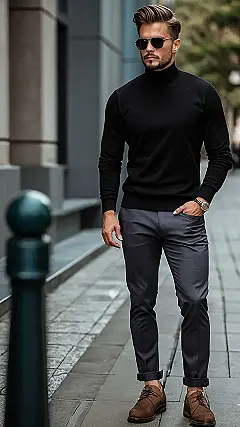 This guy’s got corporate casual down pat! Forget stuffy suits—he’s rocking a sleek black turtleneck, some seriously stylish grey pants, and brown shoes that would make even your grandpa jealous. It’s like he raided a super-stylish secret agent’s closet, but instead of saving the world, he’s ready to conquer that presentation. This look is perfect for impressing your boss without looking like you’re trying too hard. Think of it as a “smart casual” upgrade that’ll make you feel confident and comfortable all day long. No more worrying about whether your tie is crooked!