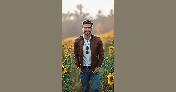 This guy is rocking a look that’s totally ready for fall! His brown leather jacket is super cool, and the white shirt underneath gives it a nice contrast. He’s got those classic blue jeans that go with anything, and his smile is like a ray of sunshine, just like those giant sunflowers behind him!