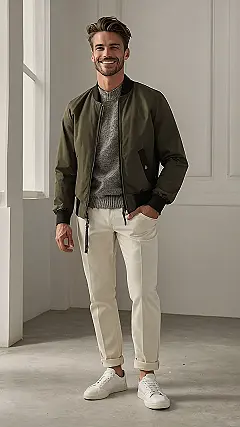 This guy knows how to rock a bomber jacket! He’s got the whole “I’m cool, but I’m not trying too hard” vibe going on, which is totally the best look. He’s paired his green bomber with some super comfy-looking white pants and some classic white sneakers. It’s a classic look that’s always in style and perfect for anything from a day at school to hanging out with friends.