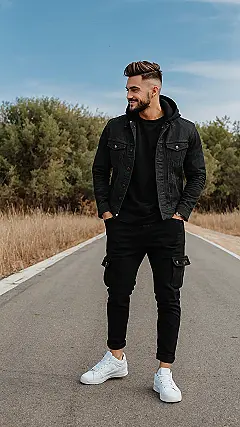 Seriously, imagine walking down the street in this getup. You’ve got the cool black on black action happening, and those bright white sneakers just pop. It’s the kind of simple but powerful men’s streetwear look that makes you feel ready for whatever the day throws at you, whether that’s meeting up with friends or just looking amazing while, you know, standing on a road in the middle of nowhere like this guy. These jeans make looking effortlessly stylish look, well, effortless!