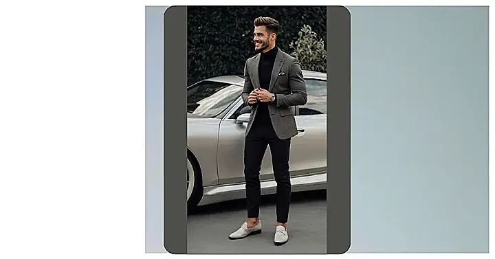This guy’s got the whole “men’s fashion blazer” thing down! That grey blazer is seriously stylish, like something you’d see in a movie about a super-cool secret agent (but way less explosions). Paired with the black turtleneck and pants, he’s the definition of effortlessly cool. Plus, those loafers? They’re fancy enough to make your teachers jealous, but comfortable enough for a casual Friday – or maybe even a sneaky afternoon drive in a sleek silver car like the one he’s posing with!
