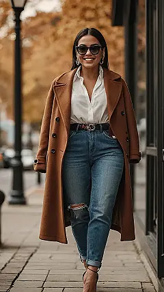 This girl is rocking the fall look! That camel coat is totally on point, like a warm hug in a piece of clothing. You can totally picture her strutting through the leaves, feeling confident and stylish. It’s a classic look that never goes out of style, and it’s perfect for those crisp autumn days.