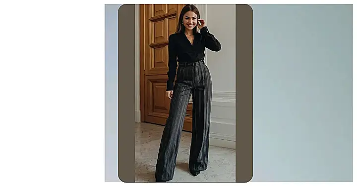 This outfit is giving major “business casual” vibes, but with a fun twist! The wide-legged trousers look super comfy and flowy, almost like a skirt. You could totally rock this look at school, a job interview, or even a fancy dinner with your fam. Imagine yourself strutting around in these trousers, feeling confident and stylish! You’ll definitely be the coolest person in the room, especially if you pair it with a killer pair of heels!