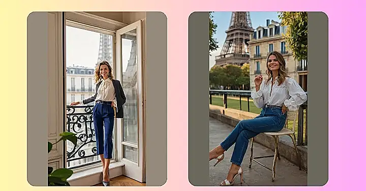 So, you wanna look effortlessly cool like you just stepped out of a French movie? This outfit is your ticket! It’s like comfy jeans met a fancy blouse and decided to hang out in Paris. Who knew you could look this chic while practically wearing pajamas on top? Just add a smize and suddenly, everyone thinks you’re secretly a celebrity.
