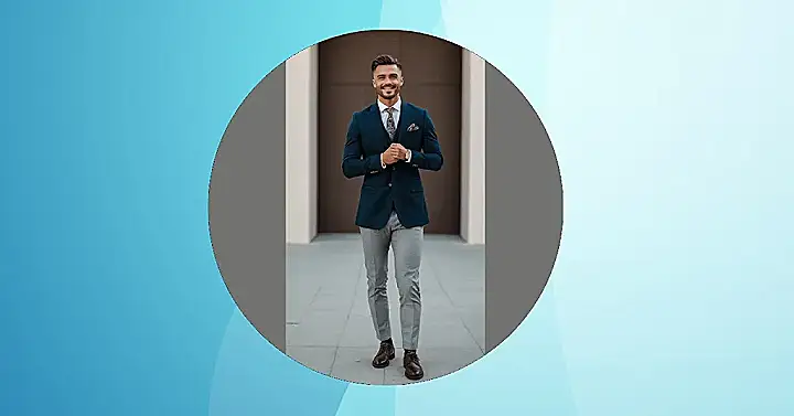 Check out this guy looking seriously sharp! He’s got that suit game on lock, adjusting his tie like he’s about to walk onto a movie set or maybe just heading out for some seriously important business (like choosing the best snack). That perfectly fitted navy blazer, grey trousers, and shiny shoes? Yeah, he’s definitely winning at the looking-good game right now.