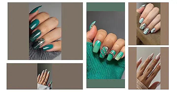 Okay, so maybe “light” green is pushing it a little, but these nails are definitely giving us some serious style inspo! They’re like if a cool forest fairy decided to get a manicure at a fancy rock concert. Seriously, that jewel nail is screaming “I’m ready to party,” while the others are all sleek and ready to rule the world.