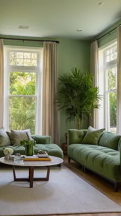 The sofa is so inviting and cozy. Picture yourself curled up there with a good book (or maybe your phone, let’s be real), while sunlight streams through the window. It’s like bringing the outdoors in, but without the bugs and muddy shoes. This greenery living room is definitely giving off a peaceful vibe!