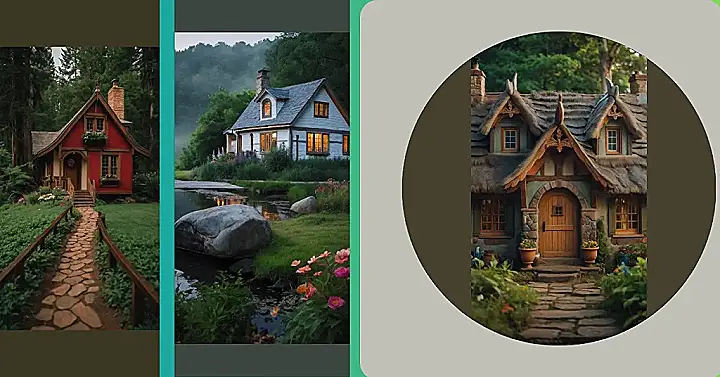 The first cottage looks like it’s straight out of a fairytale! It’s got a charming stone chimney and a roof that looks like it’s made of shingles from a thousand different trees. It’s surrounded by a lush green lawn, perfect for playing hide-and-seek or just relaxing under the warm summer sun. This cottage feels like a place where dreams come true, filled with cozy fireplaces and stories whispered in the moonlight.