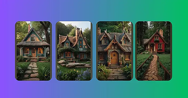 The first cottage looks like it’s straight out of a fairytale! It’s got a charming stone chimney and a roof that looks like it’s made of shingles from a thousand different trees. It’s surrounded by a lush green lawn, perfect for playing hide-and-seek or just relaxing under the warm summer sun. This cottage feels like a place where dreams come true, filled with cozy fireplaces and stories whispered in the moonlight.