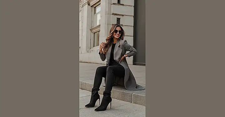 This picture shows a woman rocking a seriously stylish, yet totally comfy outfit! Imagine strolling down the street, feeling like a total boss, all while being dressed for maximum comfort. Think sleek black pants, a cozy grey blazer that’s perfect for layering, and killer boots – this look is the epitome of “casual cool.” It’s so easy to copy, you could probably put it together from stuff already hanging in your closet!