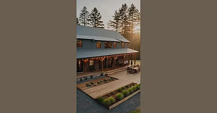 Imagine this: you’re chilling in your super-stylish barndominium, a cozy and compact home that’s way cooler than a regular house. It’s got all the modern amenities, big windows that let in tons of light, and a rustic wooden exterior that screams “sophisticated farmhouse.” Picture yourself relaxing by the fire pit at night, roasting marshmallows with friends—under the stars! The image shows just how amazing it could be, with a big, inviting fire pit, ready for all your evening hangouts and stories. It’s the perfect blend of comfortable and compact living!