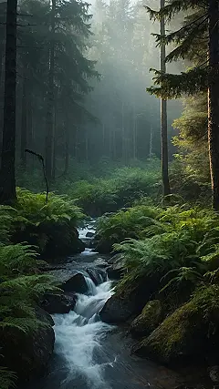 This picture is like a scene from a fairytale! Imagine walking through this misty forest, the air cool and damp against your skin. The trees are so tall that their branches reach up into the clouds, almost like they’re trying to touch the sky. There’s a little river winding its way through the forest, bubbling over rocks like it’s singing a secret song. You can almost hear the whispers of the wind through the trees and the soft rustle of leaves under your feet. It’s the perfect place to get lost in your thoughts and escape the hustle and bustle of everyday life.