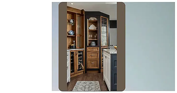 So, you’re thinking about your kitchen cabinets, huh? Check out the cabinets here – it’s like they’re having a fashion show! You’ve got natural wood looking all sophisticated with glass doors to show off your fancy dishes, and then some dark borders jump in to give it all a modern twist. It’s like they couldn’t decide on one style, so they mixed them all together. Maybe this kitchen is going for the “eclectic grandma” look, but honestly, it seems cozy and welcoming.