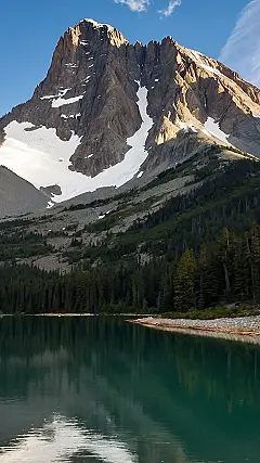 This photo is like a postcard from a giant’s backyard! Imagine hiking up to the top of that mountain – wow, what a view! You’d be able to see for miles and miles, maybe even spot some tiny bears playing in the forest below (don’t worry, just kidding about the bears – mostly!). The mountain’s rocky face, partly covered in snow, looks both majestic and a little bit goofy at the same time, like it’s trying to hide from the sun behind a fluffy white scarf. The crystal-clear lake reflecting the mountain makes it look like you could reach out and touch the sky. It’s the perfect example of what amazing mountain top view photography can capture!