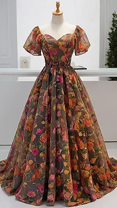 This dress is like a walking garden party! Just imagine: you, twirling in this gorgeous floral frock, feeling like a total princess (or queen, let’s be honest). The colors are autumn-perfect – think warm sunsets and cozy fireplaces – and the flowers? They’re so vibrant, you might just attract a swarm of friendly bumblebees (though maybe not, we hope!). It’s the kind of dress that makes you want to skip down the street, and definitely makes you the belle of the ball, or prom, or even just a casual Tuesday.
