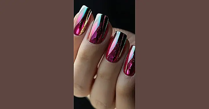 These nails are seriously out of this world! Look at that shimmery, sparkly, red-hot goodness! It’s like someone dipped their fingers in a pot of liquid jewels and gold. Imagine showing these off at school – you’d be the coolest kid in the cafeteria! They’re the perfect mix of glam and edgy; the dark, metallic colours are so sophisticated but the little pops of pink and gold add a fun, playful touch. They’re not your grandma’s nails, that’s for sure!