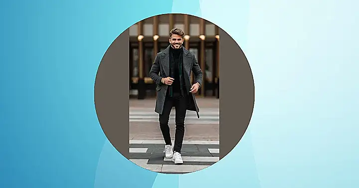 This guy is totally rocking the fall fashion scene! He’s got the perfect combination of layers: a cozy turtleneck, a cool scarf, and a stylish coat to keep him warm. And let’s not forget those crisp white sneakers – they’re like the pumpkin spice latte of footwear: totally on-trend and super delicious.