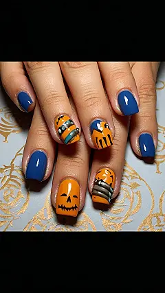 These nails are so cute, they’re practically begging to be seen! You’ve got your classic blue, but then there’s the real star of the show: a super-fun scarecrow design. It’s like those friendly guys from the fields decided to hop on your fingers! The orange and yellow colors are perfect for fall, and that little stitched-up face is super-charming. You’re gonna be the coolest ghoul in school with these nails!